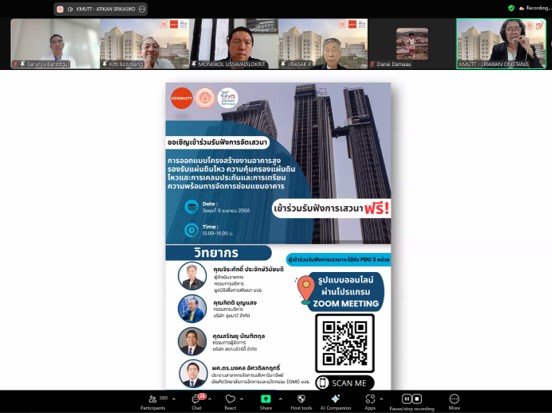 วันพุธที่ 9 เมษายน 2568 ภาควิชาวิศวกรรมโยธา ร่วมกับ มูลนิธิเพื่อการพัฒนามหาวิทยาลัยเทคโนโลยีพระจอมเกล้าธนบุรีและ ชมรมศิษย์เก่าโยธาบางมด การจัดเสวนา หัวข้อการออกแบบโครงสร้างงานอาคารสูงรองรับแผ่นดินไหว ความคุ้มครองแผ่นดินไหวและการเคลมประกันและการเตรียมความพร้อมการจัดการซ่อมแซมอาคารโดยได้รับเกียรติจากคุณจิระศักดิ์ ประจักษ์วินัยบดี กรรมการบริหาร บริษัท เอเชีย เมเนจเมนต์ แอนด์ ดีไซน์ จำกัด คุณกิตติ บุญแสง กรรมการบริหาร บริษัท อุมบาว์ จํากัด คุณสรัณยุ บัณฑิตกุล กรรมการผู้จัดการ บริษัท สยามชัวร์ตี้ จำกัด และผศ.ดร.มงคล อัศวดิลกฤทธิ์ ประธานสาขาการจัดการอสังหาริมทรัพย์ บัณฑิตวิทยาลัยการจัดการและนวัตกรรม มจธ. เป็นคณะวิทยากรเข้าร่วมเสวนา การเสวนาครั้งนี้จัดขึ้นเพื่อสร้างความเข้าใจในการนำความรู้ทางวิชาชีพได้อย่างมีความปลอดภัยและพิจารณาประเด็นในการเคลมประกันภัยมาใช้ในการทำงานได้อย่างมีประสิทธิภาพ รวมไปถึงการเตรียมความพร้อมการจัดการซ่อมแซมอาคารหลังจากเหตุการณ์แผ่นดินไหว การเสวนาในครั้งนี้ไม่มีค่าใช้จ่าย ซึ่งจัดเสวนาในรูปแบบออนไลน์ ผ่านโปรแกรม Zoom Meeting โดยมีผู้เข้าร่วม จำนวน 395 คน