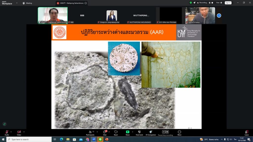ภาควิชาวิศวกรรมโยธา คณะวิศวกรรมศาสตร มจธ.ร่วมกับมูลนิธิเพื่อการพัฒนา มจธ. ได้จัดโครงการอบรมออนไลน์ ครั้งที่ 25 ในหัวข้อ “ปัญหาคอนกรีตในงานก่อสร้าง และแนวทางการป้องกันการแตกร้าวของการเทคอนกรีตหลา” ภายใต้โครงการพัฒนาทักษะวิศวกรรมโยธา Reskill – Upskill – New Skill เมื่อวันพฤหัสบดีที่ 18 ธันวาคม พ.ศ. 2568 ผ่านระบบ Zoom Meeting โดยมีผู้เข้าร่วม 70 คน การอบรมครั้งนี้มีวัตถุประสงค์เพื่อถ่ายทอดองค์ความรู้เชิงปฏิบัติที่สามารถนำไปประยุกต์ใช้ได้จริงในงานภาคสนาม ครอบคลุมตั้งแต่การควบคุมคุณภาพคอนกรีต การผสม การเท และการบ่มคอนกรีต เพื่อช่วยลดปัญหาความเสียหายของโครงสร้าง เพิ่มความปลอดภัยในการใช้งานอาคาร และยกระดับมาตรฐานงานก่อสร้างของประเทศไทยให้สอดคล้องกับมาตรฐานสากล ในช่วงเช้า ผู้เข้าร่วมได้รับฟังการบรรยายในหัวข้อ “ปัญหาคอนกรีตในงานก่อสร้าง” โดย ผศ. ดร.รักติพงษ์ สหมิตรมงคล อาจารย์ประจำภาควิชาวิศวกรรมโยธา มจธ. ซึ่งได้ถ่ายทอดประสบการณ์และกรณีศึกษาที่พบได้บ่อยในงานก่อสร้างจริง พร้อมแนวทางการแก้ไขอย่างเป็นระบบ ช่วงบ่าย เป็นการบรรยายในหัวข้อ “แนวทางการป้องกันการแตกร้าวของการเทคอนกรีตหลา” โดย รศ. ดร.สมิตร ส่งพิริยะกิจ คณบดีวิทยาลัยเทคโนโลยีอุตสาหกรรม มจพ. และประธานสาขาวิศวกรรมโยธา วิศวกรรมสถานแห่งประเทศไทยฯ ซึ่งได้ให้ความรู้เชิงลึกเกี่ยวกับสาเหตุของการแตกร้าว เทคนิคการวางแผนงาน และการควบคุมคุณภาพเพื่อป้องกันปัญหาในระยะยาว นอกจากนี้ผู้เข้าอบรมที่มีเลขที่สมาชิกสภาวิศวกร และเข้าร่วมการอบรมตลอดจนทำแบบทดสอบประเมินความรู้ จะได้รับจำนวนหน่วยความรู้ (PDU) เพื่อการพัฒนาวิชาชีพวิศวกรรมอย่างต่อเนื่อง (CPD) จากสภาวิศวกรอีกด้วย