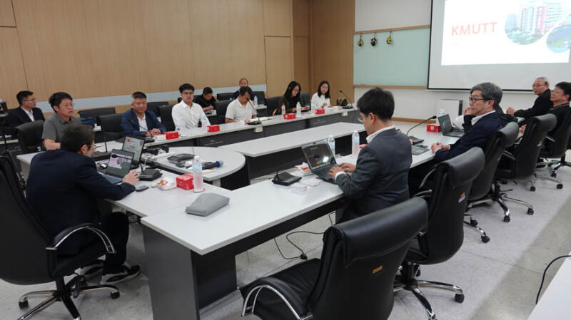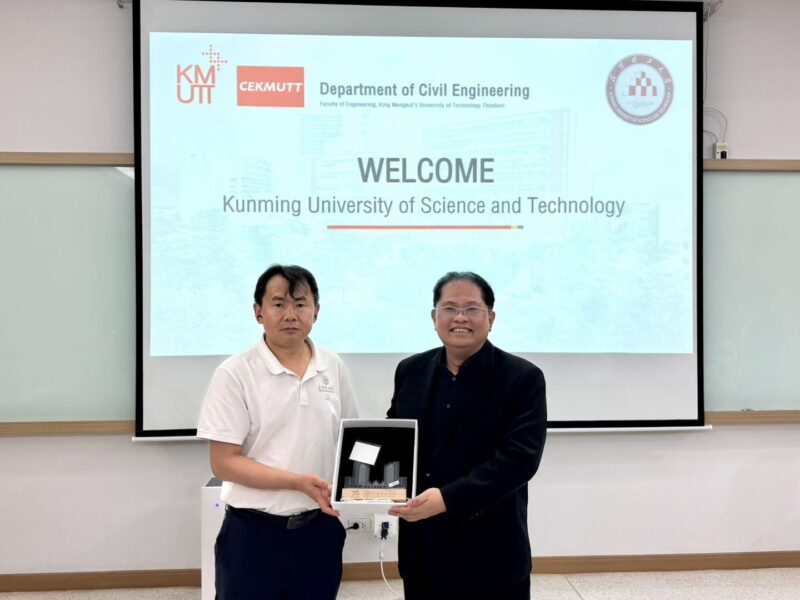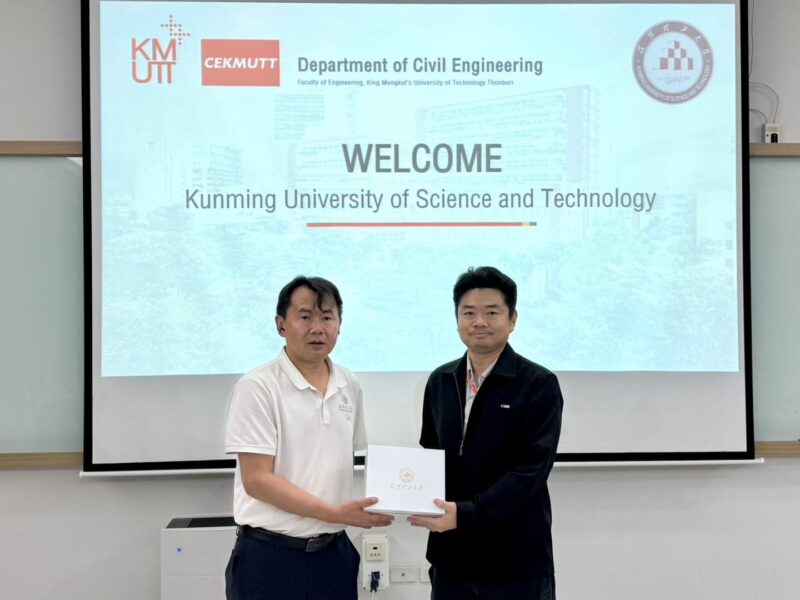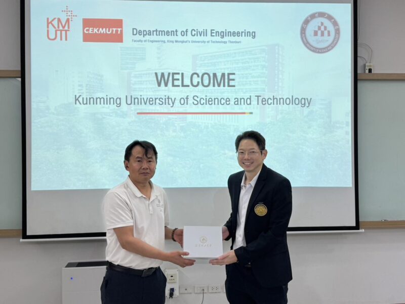 เมื่อวันที่ 19 ธันวาคม 2568 ภาควิชาวิศวกรรมโยธา คณะวิศวกรรมศาสตร์ มหาวิทยาลัยเทคโนโลยีพระจอมเกล้าธนบุรี (มจธ.) ได้ให้การต้อนรับคณะผู้บริหารและคณาจารย์จาก Kunming University of Science and Technology (KUST) สาธารณรัฐประชาชนจีน ในโอกาสเข้าเยี่ยมชมและหารือความร่วมมือทางวิชาการในการนี้ได้รับเกียรติจาก ศาสตราจารย์ ดร.สุทัศน์ ลีลาทวีวัฒน์ ผู้อำนวยการสำนักวิจัยและบริการวิทยาศาสตร์และเทคโนโลยี มจธ. พร้อมด้วย รองศาสตราจารย์ ดร.ชัยณรงค์ อธิสกุล และ ผู้ช่วยศาสตราจารย์ ดร.เอกชัย อยู่ประเสริฐชัย รองหัวหน้าภาควิชาวิศวกรรมโยธา ร่วมให้การต้อนรับอย่างอบอุ่นกิจกรรมดังกล่าวประกอบด้วยการหารือแนวทางความร่วมมือทางวิชาการและการวิจัยในอนาคต รวมถึงการนำเสนอผลงานวิจัยและนวัตกรรมที่โดดเด่นของภาควิชาฯ อาทิCIFIR: ศูนย์นวัตกรรมการก่อสร้างและโครงสร้างพื้นฐานแห่งอนาคตงานวิจัยด้าน วิศวกรรมแผ่นดินไหวการเยี่ยมชมห้องปฏิบัติการทางวิศวกรรมโยธา และงานวิจัยด้านวิศวกรรมโครงสร้างที่ทันสมัยการมาเยือนในครั้งนี้ถือเป็นอีกหนึ่งก้าวสำคัญในการเสริมสร้างและขยายเครือข่ายความร่วมมือระดับนานาชาติ อันจะนำไปสู่การพัฒนางานวิจัย นวัตกรรม และการพัฒนาบุคลากรด้านวิศวกรรมโยธาให้ก้าวหน้าและเข้มแข็งยิ่งขึ้นในอนาคต
