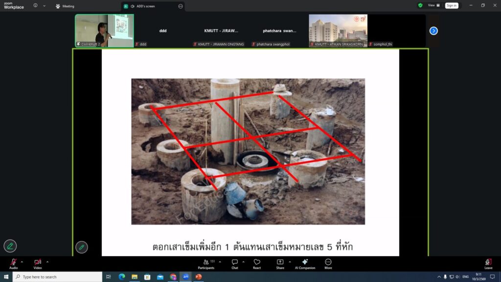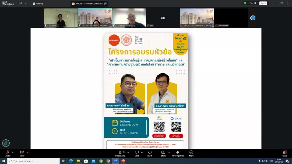 เมื่อวันอังคารที่ 10 มีนาคม 2569 ภาควิชาวิศวกรรมโยธา คณะวิศวกรรมศาสตร์ มจธ. ร่วมกับมูลนิธิเพื่อการพัฒนา มจธ.จัดโครงการอบรมในหัวข้อ “เสาเข็มเจาะขนาดใหญ่และเทคนิคการก่อสร้างใต้ดิน” และ “เจาะลึกงานสร้างอุโมงค์: เทคโนโลยี ท้าทาย และนวัตกรรม” ในรูปแบบออนไลน์ผ่านระบบ Zoom Meeting การอบรมครั้งนี้ได้รับความสนใจจากวิศวกร ผู้ควบคุมงาน ผู้ประกอบการ นักศึกษา และผู้ที่เกี่ยวข้องในวงการก่อสร้างเข้าร่วม 230 คน เพื่อร่วมแลกเปลี่ยนความรู้และประสบการณ์เกี่ยวกับเทคนิคการก่อสร้างโครงสร้างพื้นฐานขนาดใหญ่ งานฐานราก และงานก่อสร้างอุโมงค์ ซึ่งเป็นองค์ความรู้สำคัญในงานวิศวกรรมโยธายุคปัจจุบัน โดยได้รับเกียรติจากผู้เชี่ยวชาญในสายงานวิศวกรรมโยธา ได้แก่ ดร.ชาญชัย ทรัพย์มณีวงศ์ อนุกรรมการปฐพี –TUTG วสท. และผู้ชำนาญการจากสภาวิศวกร บรรยายในหัวข้อเกี่ยวกับเสาเข็มเจาะขนาดใหญ่และเทคนิคการก่อสร้างใต้ดิน รวมถึง คุณเอกพงศ์ รุ่งเรือง ผู้จัดการโครงการ จากบริษัท ช.การช่าง จำกัด (มหาชน) ถ่ายทอดความรู้ด้านเทคโนโลยีและนวัตกรรมการก่อสร้างอุโมงค์ พร้อมกรณีศึกษาจากโครงการจริง โครงการอบรมดังกล่าวเป็นส่วนหนึ่งของการพัฒนาทักษะด้านวิศวกรรมโยธา ภายใต้แนวคิด Reskill – Upskill – New Skill เพื่อสนับสนุนการเรียนรู้ตลอดชีวิต และเสริมสร้างองค์ความรู้ให้กับบุคลากรในอุตสาหกรรมก่อสร้างให้สามารถนำไปประยุกต์ใช้ในการทำงานได้อย่างมีประสิทธิภาพและสอดคล้องกับมาตรฐานวิชาชีพวิศวกรรม