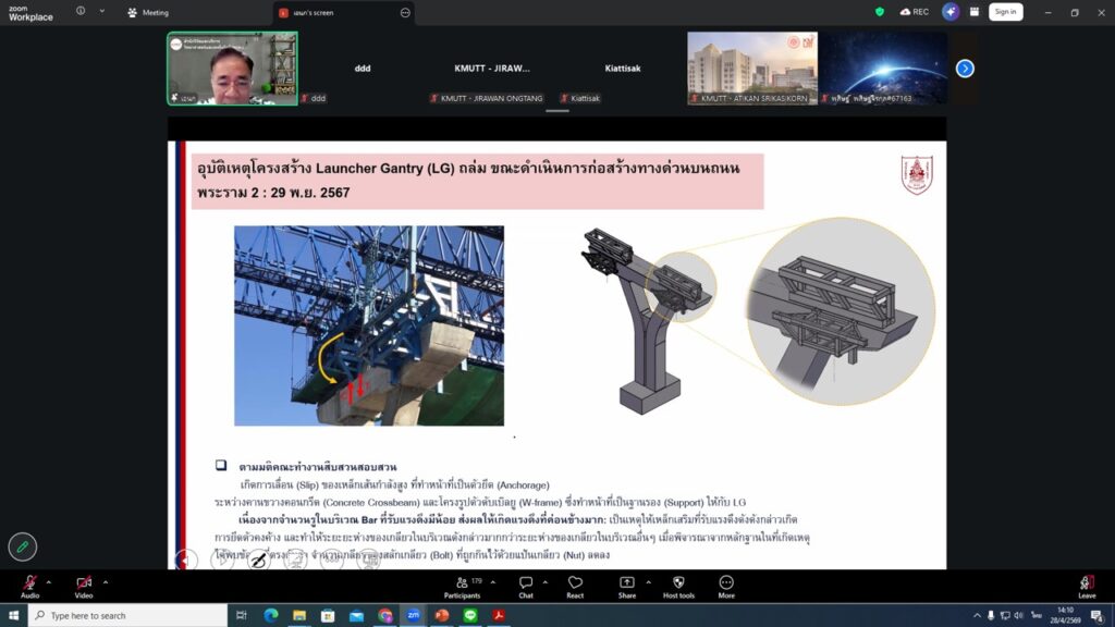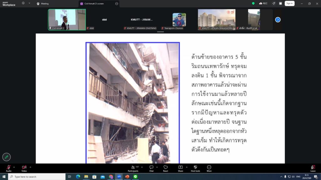 ภาควิชาวิศวกรรมโยธา คณะวิศวกรรมศาสตร์ มจธ. ร่วมกับ มูลนิธิเพื่อการพัฒนา มจธ. จัดโครงการอบรมในหัวข้อ “ประสบการณ์การยกย้ายอาคารและการวิบัติของอาคาร” และ “เครนถล่มพระรามสองกับมาตรฐานความปลอดภัย” เมื่อวันอังคารที่ 28 เมษายน 2569 ในรูปแบบออนไลน์ผ่านโปรแกรม Zoom Meeting การจัดอบรมครั้งนี้มีวัตถุประสงค์เพื่อถ่ายทอดองค์ความรู้และประสบการณ์จริงด้านวิศวกรรมโยธา โดยมุ่งเน้นการสร้างความเข้าใจเกี่ยวกับการยกย้ายอาคาร กลไกการวิบัติของโครงสร้าง รวมถึงการวิเคราะห์กรณีศึกษาเหตุการณ์เครนถล่ม เพื่อเสริมสร้างทักษะด้านการประเมินความเสี่ยง การวางแผนงาน และการยกระดับมาตรฐานความปลอดภัยในการปฏิบัติงานก่อสร้างภายในงานได้รับเกียรติจากผู้ทรงคุณวุฒิในแวดวงวิศวกรรม ได้แก่ ผศ. ดร.ธเนศ วีระศิริ อดีตนายกสภาวิศวกร รศ. เอนก ศิริพานิชกร นายกวิศวกรรมสถานแห่งประเทศไทย ในพระบรมราชูปถัมภ์ ร่วมถ่ายทอดความรู้และแลกเปลี่ยนประสบการณ์แก่ผู้เข้าร่วมอบรม จำนวน 200 คน การอบรมดังกล่าวเป็นส่วนหนึ่งของโครงการพัฒนาทักษะด้านวิศวกรรมโยธา (Reskill – Upskill – New Skill) ที่มุ่งสร้างสังคมแห่งการเรียนรู้ และส่งเสริมศักยภาพบุคลากรในสายงานวิศวกรรมให้สามารถรองรับความท้าทายของงานก่อสร้างยุคใหม่ได้อย่างมีประสิทธิภาพและปลอดภัย